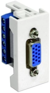 Charakteryzuje sie zwartą kompaktową budową dzięki czemu można je używać w kanałach kablowych o głębokości już od 40mm. Gniazdo niskopradowe VGA w adapterze 22,5x45 (1 moduł), montaż w standardzie 45x45, złącze D-Sub 15-pin żeńskie, podłączenie przewodów na zacisk śrubowy 6-pin(RGB). Przeznaczone do zastosowania w systemach teleinformatycznych i audio/video( monitor ). Montaż przez zatrzaśnięcie w uchwycie szybkiego montażu UCHKP, obudowie natynkowej OBUK, ramce maskującej RAMK.