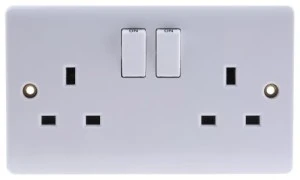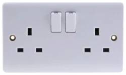 Torebka ze śrubami mocującymi i białymi plastikowymi pokrywkami śrubowymi. Przełączane gniazda 13A. BS1363 13A, jedno-stykowe, przełączane gniazda w kolorze białym.