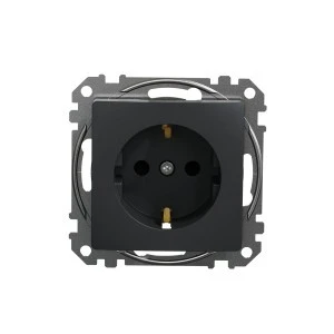Gniazdo zasilające schuko z przesłonami torów prądowych, czarny antracyt, to osprzęt serii Sedna Design & Elements marki Schneider Electric. Gniazdo zasilające ma malowane wykończenie powierzchni w kolorze czarnego antracytu i posiada następujące wymiary: szerokość 73 m m, wysokość 73 mm, głębokość 41 mm, głębokość wystawania 29 mm. Długość izolacji zdejmowanej z kabla to 13 mm. Gniazdo charakteryzuje się stopniem ochrony IP20 i zakresem mocy wynoszącym 3680 W. Do produkcji gniazda wykorzystano tworzywo termoplastyczne o zwiększonej od porności na promieniowanie UV. Produkt jest montowany podtynkowo i posiada zaciski śrubowe. Uwaga: produkty Sedna Design & Elements nie są kompatybilne z serią Sedna!