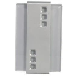 Gong elektromechaniczny,obudowa z tworzywa sztucznego nakrytego taflą hartowanego szkła (o grubości 8mm) i ozdobną nakładką w srebrnym kolorze,nowoczesne, eleganckie wzornictwo,dźwięk: dwa tony BIM-BAM, powtarzające się ciągle w czasie trzymania przycisku,poziom dźwięku: ok. 80 dB.