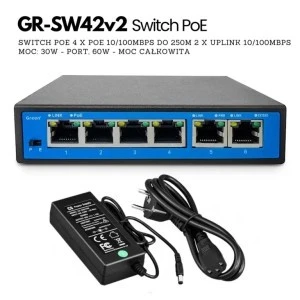 GR-SW42 to 4-portowy switch sieciowy przeznaczony do współpracy z kamerami IP-CCTV oraz wszelkimi innymi urządzeniami działającymi w standardzie IEE 802.3af/at, który do przesyłu danych za pomocą pojedynczego przewodu wykorzystuje technologię PoE
