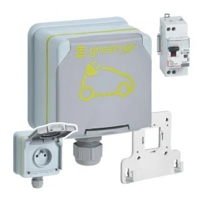 Zestaw do bezpiecznego ładowania pojazdów elektrycznych i hybrydowych za pomocą kabla Mode 2 (lub Mode 1). Zasilane bezpośrednio z rozdzielnicy: 1 dedykowana linia 3 x 2,5 mm2 , chroniona przez 1 wył. RCBO (1 linia na gniazdo) Zestaw zawiera: - 1 wzmocnione gniazdo Green’up Access , plastikowe z klapką, IP 66 - IK 08 - 16 A - 230 V, zaciski śrubowe 6 mm2 , zgodne z IEC/EN 60884-1 - 1 uchwyt montażowy do zawieszenia kabla ładowania pojazdu. - 1 wyłącznik różnicowonadprądowy (RCBO) 20 A, char. C, 30 mA, typ F