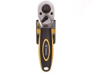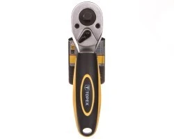 Grzechotka krótka podwójna 1/2 cala x 3/8 cala, 135 mm, stal CrV, mechanizm zapadkowy 72 zęby, przełącznik kierunku obrotów, dwumateriałowy uchwyt, DIN 3122