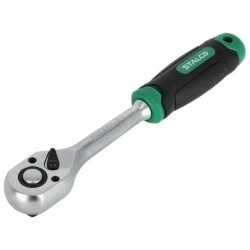 Grzechotka prosta jest narzędziem ręcznym przydatnym w wielu zadaniach. Została wyposażona w trzpień przeznaczony do mocowania na nim nasadek i akcesoriów z gniazdami nasadkowymi. Sprawdza się przy dokręcaniu i odkręcaniu elementów gwintowanych. Może być potrzebna w czasie prac budowlanych, mechanicznych i monterskich. Grzechotka prosta STALCO jest wyposażona w mechanizm zapadkowy składający się z 45 zębów. Daje on możliwość szybkiego dokręcania akcesoriów ze znaczną mocą. W górnej części grzechotki znajduje się dźwignia do zmiany kierunku działania zapadek. Narzędzie jest wykonane ze stali chromowo-wanadowej, co zapewnia mu odporność na uszkodzenia mechaniczne i korozję. Ergonomiczna rączka umożliwia pewne utrzymanie narzędzia nawet w czasie intensywnych prac. Grzechotka prosta w asortymencie STALCO jest dostępna w trzech wariantach, a trzpień roboczy ma kolejno 1/4, 3/8 i 1/2 cala.