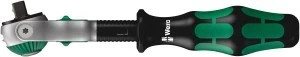 Grzechotka Zyklop z zabierakiem 1/4". Drobnozębny mechanizm zapadkowy z 72 zębami zapewniający niewielki kąt powrotu zapadki wynoszący zaledwie 5°. Główka grzechotki może być swobodnie obracana i blokowana w dowolnym położeniu za pomocą przełącznika suwakowego znajdującego się po obu stronach. Gwarantuje to bezproblemową pracę nawet w bardzo wąskich lub trudno dostępnych miejscach, zapewniając wystarczającą przestrzeń dla ruchu ręki. Blokowanie położenia główki w pozycji 0° oraz 15° i 90° w prawo i lewo gwarantuje bezpieczną pracę bez ryzyka "wyślizgiwania się" główki grzechotki. W pozycji 0° i przy zastosowaniu adapteru i bitu może być stosowana jak standardowy wkrętak. Konstrukcja wykorzystująca masę własną narzędzia pozwala na znaczne przyspieszenie montażu. Symetryczna konstrukcja obrotowej rękojeści Kraftform i swobodnie obracająca się tuleja ułatwiają szybkie obracanie. Kształt rękojeści Kraftform doskonale dopasowuje się do kształtu dłoni, chroniąc ją przed powstawaniem pęcherzy i odcisków. Twarde elementy materiału rękojeści pozwalają na szybkie pokręcanie bez ryzyka "przyklejania się" dłoni do rękojeści. Miękkie, antypoślizgowe strefy umożliwiają bezstratne przenoszenie dużych sił. Do kluczy nasadowych czworokątnych 1/4" i adapterów z zabierakiem czworokątnym 1/4", z zatrzaskiem kulkowym.