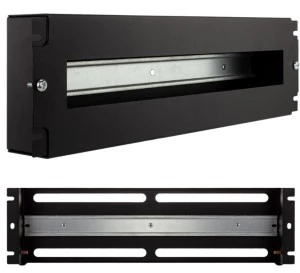 Panel dystrybucji napięć to uniwersalna obudowa przeznaczona do montażu aparatury elektrycznej w wykonaniu modułowym. Wyposażona jest w szynę TS35 oraz osłonę przednią z otworem o wymiarach 400x45mm. Maksymalna pojemność panelu wynosi 22 moduły o szerokości 17,5mm. Obudowa została pomalowana proszkowo na kolor czarny. Mocowanie odbywa się 6-punktowo do pionowych szynek rackowych.