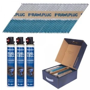 W opakowaniu znajdziemy komplet 3300 gwoździ oraz dodatkowo 3 gazy z zaworami. Całość to praktyczne i wygodne rozwiązanie dla potrzeb montażowych, gwarantujące bardzo wysoką wydajność pracy.