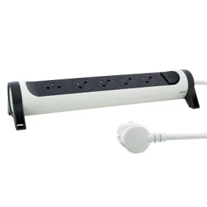 - 5 "płaskich" gniazd 2P+Z (4 ustawione pod kątem 45° i 1 odsunięte i ustawione pod kątem 90° do podłączenia np. zasilacza bez blokowania sąsiedniego gniazda)