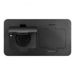 Wysoki stopień ochrony IP55 zapewnia odporność na pył i na strumienie wody, a także użytkowanie produktu przez lata. Gniazdo zostało wykonane z trwałego stopu cynku i wysokiej jakości tworzywa sztucznego, by zapewnić niezawodność w działaniu. Czarne wykończenie daje poczucie estetyki i minimalizmu. Dodatkowym zabezpieczeniem jest wbudowana klapka ochronna, zabezpieczająca gniazda przed kurzem i wilgocią. Klapka otwiera się pod kątem 110°, pozwalając tym samym na wygodny dostęp do gniazd.