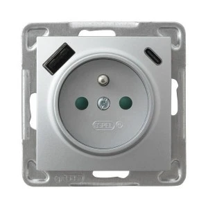 IMPRESJA Gniazdo pojedyncze z uziemieniem z przesłonami torów prądowych, z ładowarką USB A+C srebro GP‑1YZPUSBAC/m/18