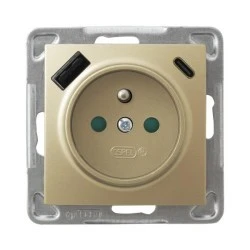 IMPRESJA Gniazdo pojedyncze z uziemieniem z przesłonami torów prądowych, z ładowarką USB A+C złoty metalik GP‑1YZPUSBAC/m/28