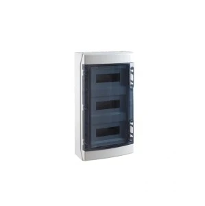 IP65 PC Rozdzielnica modułowa 3x12 ECOLOGY (1500V DC) PE+N to niezawodna i nowoczesna rozdzielnica modułowa, stworzona z myślą o wymagających instalacjach. Dzięki stopniowi ochrony IP65 zapewnia pełną szczelność przed pyłem i wodą, a odporność udarowa IK08 gwarantuje trwałość nawet w trudnych warunkach. Przeznaczona do napięcia izolacji do 1500V. Jednorządowa konstrukcja mieszcząca 12 modułów pozwala na optymalne rozmieszczenie elementów, a transparentne drzwi ułatwiają kontrolę wnętrza. Szary kolor (RAL 7035) i estetyczne wykończenie pasują do każdego otoczenia. Wymiary: 586x310x148 mm.