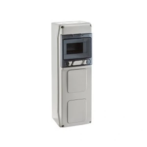 IP65 Rozdzielnica budowlana 1x6 STAR (1500V DC) z otworami na gniazda przemysłowe to wytrzymała rozdzielnica natynkowa o stopniu ochrony IP65 i odporności mechanicznej IK08, wykonana z tworzywa sztucznego. Posiada 1 rzędy po 6 modułów, szynę DIN, pojedyncze transparentne drzwi oraz opcjonalny zamek na przycisk. Wymiary: 436 x 142 x 137 mm. Oferuje 6 wejść kablowych i 2 otwory. Posiada II klasę izolacji i jest przystosowana do napięcia izolacji 1000V AC / 1500V DC.