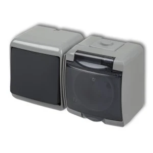 JUNIOR Łącznik jednobiegunowy z gniazdem hermetycznym (klapka dymna) popielaty / grafitowy 30WGHH-1dp