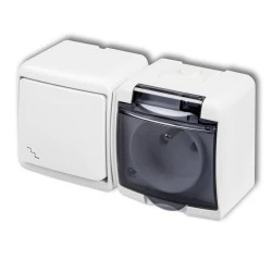 JUNIOR Łącznik jednobiegunowy + gniazdo hermetyczne (klapka biała) biały IP54 WGHH-1