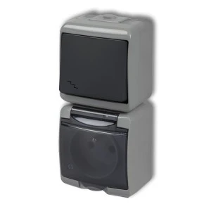 JUNIOR Łącznik schodowy z gniazdem hermetycznym (klapka dymna) popielaty / grafitowy 30WGHP‑3dp