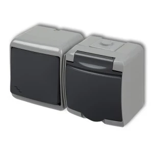 JUNIOR Łącznik schodowy z gniazdem hermetycznym (klapka grafitowa) popielaty / grafitowy 30WGHH‑3
