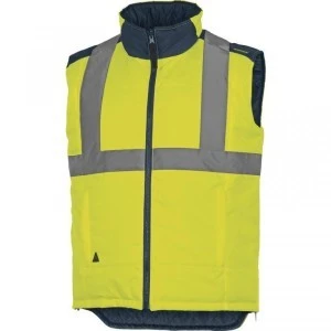 Kamizelka ostrzegawcza dwustronna z poliestru oxford powlekanego poliuretanem i pikowanego poliestru, zapinanie na zamek błyskawiczny. 4 kieszenie. Odzież ostrzegawcza: klasa 2 - kolor srebrny - montaż szelkowy, kolor żółty fluo-granatowy rozmiar XL, zarkes rozmiarów: S DO 3XL