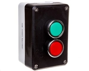 Kaseta żółto-szara, wyposażona w trzy przyciski: 2 kryte, czerwony 1NC i zielony 1NO oraz 1 przycisk awaryjnego stopu – dłoniowy ryglowany 30 mm czerwony 1NC.
