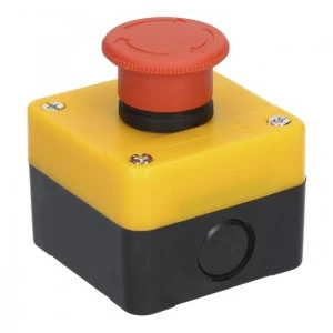 Awaryjny przycisk bezpieczeństwa załączany poprzez bezpośrednie wciśnięcie grzybka, odryglowywany poprzez obrót.