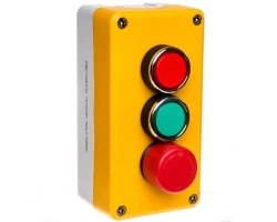 Kaseta żółto-szara, wyposażona w trzy przyciski: 2 kryte, czerwony 1NC i zielony 1NO oraz 1 przycisk awaryjnego stopu – dłoniowy ryglowany 30 mm czerwony 1NC.