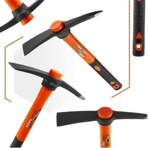 Kilof o wadze 400 gramów to lekki i skuteczny ręczny przyrząd przeznaczony do pracy z twardą glebą, cegłą, betonem, a także do usuwania korzeni oraz wykonywania niewielkich otworów. Część robocza narzędzia posiada dwie funkcjonalne powierzchnie: płaską (młotek) oraz zaostrzoną (kilof), co pozwala skoncentrować siłę uderzenia w celu kruszenia materiału. Narzędzie wyposażone jest w rękojeść z włókna szklanego o długości 330 mm, która zapewnia doskonałe tłumienie drgań, zmniejszając obciążenie dłoni. Rdzeń z włókna szklanego jest odporny na wilgoć i uszkodzenia, a jego antypoślizgowa powłoka gwarantuje pewny i komfortowy chwyt.