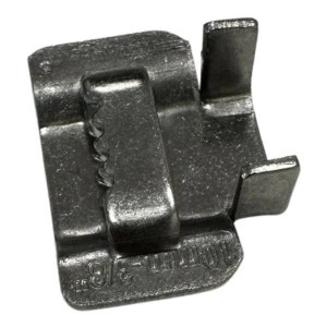 Klamerka/spinka z ząbkami do taśmy stalowej 10 mm marki Sdünnger zapewnia szybkie i pewne zaciskowe mocowanie opasek; ząbki trwale blokują taśmę, a grubość 1,20 mm i 14-mm okno ułatwiają montaż oraz przenoszenie dużych obciążeń.
