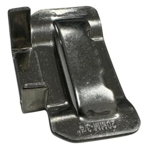 Klamerka/spinka z ząbkami do taśmy stalowej 20 mm marki Sdünnger zapewnia szybkie i pewne zaciskowe mocowanie opasek; ząbki trwale blokują taśmę, a grubość 1,50 mm i 23-mm okno ułatwiają montaż oraz przenoszenie dużych obciążeń.