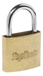 Żeliwna kłódka z miedzianą powłoką Top Tools o szerokości korpusu 40 mm. W komplecie 2 klucze.