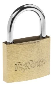Żeliwna kłódka z miedzianą powłoką Top Tools o szerokości korpusu 50 mm. W komplecie 2 klucze.