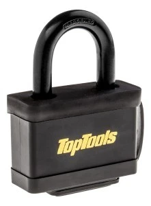 Kłódka laminowana Top Tools. Kłódka wyposażona w system automatycznego zamknięcia oraz dwustronną blokadę hartowanego jarzma. W komplecie 3 klucze.