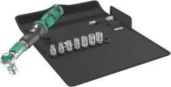 10-częściowy zestaw z kluczem dynamometrycznym 1/4" w wytrzymałym pudełku tekstylnym; klucz dynamometryczny z mechanizmem poślizgowym. Po osiągnięciu ustawionego momentu obrotowego mechanizm poślizgowy blokuje narzędzie zapobiegając niepożądanemu przekroczeniu ustawionego momentu obrotowego. Zakres regulacji od 2 do 12 Nm dla kontrolowanego dokręcania w prawo i w lewo. Łatwe ustawianie i zabezpieczanie wartości zadanej: słyszalne i wyczuwalne zablokowanie po osiągnięciu wartości skali ułatwia również niezawodne ustawienie żądanego momentu obrotowego. Z funkcją Torque Lock umożliwiającą stosowanie jako standardowa grzechotka bez momentu obrotowego. Klucz może być stosowany również do prac wymagających obrotu klucza pod kątem. Maks. moment obrotowy zrywający kwadratu ¼" zgodnie z normą DIN 3122. Kąt powrotu zapadki wynosi zaledwie 5°, dzięki czemu grzechotka może być używana również w wąskich przestrzeniach. Zestaw zawiera: klucz dynamometryczny Safe-Torque A 1, zabierak 1/4", 2-12 Nm, 8 kluczy nasadowych 1/4" i krótką przedłużkę.