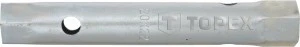 Klucz rurowy TOPEX (nr ref. 35D931) z nasadkami sześciokątnymi 8 x 9 mm. Jego napędem może być pokrętło przełożone przez otwory znajdujące się w korpusie. Sześciokątny przekrój końcówek sprawia, że możliwe jest kręcenie kluczem rurowym poprzez klucz płaski. Marka TOPEX skierowana jest do majsterkowiczów.