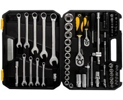 W komplecie znajdują się nasadki sześciokątne 1 cala: 14-32 mm, nasadki sześciokątne 1 cala: 4-14 mm, klucze płasko oczkowe: 8-22 mm, nasadki do świec 1 cala: 16 i 21 mm, grzechotki: 1 cala i 1 cala, przedłużki, przedłużka elastyczna 1 cala, przeguby cardana, pokrętło wkrętakowe, końcówki wkrętakowe: płaskie, krzyżowe PH, krzyżowe PZ, Torx i sześciokątne. Zestaw narzędzi mieści się w praktycznej walizce transportowej z tworzywa sztucznego, a każdy z elementów spoczywa w osobnej przegródce.