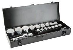 Klucze nasadowe 3, 4 cala, zestaw 20 szt., grzechotka 490 mm, 24 zęby, przełącznik kierunku obrotów, pokrętło z zabierakiem 450 mm, 2 szt. przedłużek 100, 200 mm, 16 szt. nasadek sześciokątnych, rozmiary: 19, 21, 22, 23, 24, 26, 27, 30, 32, 34, 36, 38, 41, 46, 48, 50 mm, stal CrV, metalowa walizka