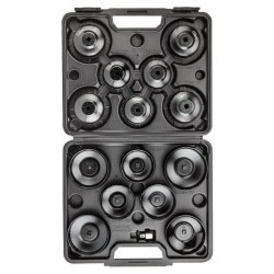 Klucze nasadowe do filtrów oleju: redukcja 3/8" - 1/2", nasadki: 14 kątna : 65 | 67 | 68 | 76 mm; 15 kątna : 74 | 75 | 77 | 80 | 82 | 90 | 93 | 100 mm; 30 kątna : 76mm; 36 kątna : 93mm