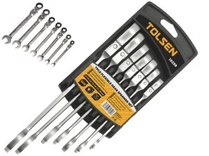 Zestaw kluczy płaskich i oczkowych z grzechotką i przegubem, do łatwiejszej manipulacji w gorzej dostępnych miejscach.