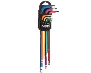 W obszernym zestawie znajduje się 9 kluczy sześciokątnych 1.5 mm, 2 mm, 2.5 mm, 3 mm, 4 mm, 5 mm, 6 mm, 8 mm i 10 mm. Produkty doskonale nadają się do różnego rodzaju prac remontowych, wykończeniowych czy instalatorskich. Klucze wyróżnia wygodna, kompaktowa konstrukcja. Prezentowany zestaw jest niezbędny w każdym garażu czy warsztacie. Marka NEO należy do polskiej Grupy TOPEX, którą cechuje poszanowanie norm i standardów najwyższej jakości i bezpieczeństwa.