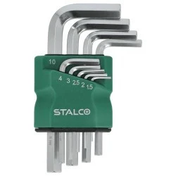 W skrzyni narzędziowej warto znaleźć miejsce na zestaw krótkich kluczy sześciokątnych. Imbusy przydadzą się do prac montażowych, napraw i regulacji mechanizmów w pojazdach. Warto umieścić je w domowej skrzyni narzędziowej i w warsztacie na wypadek niespodziewanych zadań. Zestaw krótkich kluczy sześciokątnych STALCO zawiera 9 narzędzi o wymiarach od 1,5 do 10 mm. Mają krótkie trzpienie i konstrukcję fajkową, a na każdym końcu znajduje się część robocza. Klucze są precyzyjnie uformowane ze stali chromowo-wanadowej. Zapewnia im to odporność na ścieranie i utrzymuje funkcjonalność przez długi czas. Imbusy umieszczono w poręcznym opakowaniu z tworzywa sztucznego, które zapobiega ich pogubieniu.