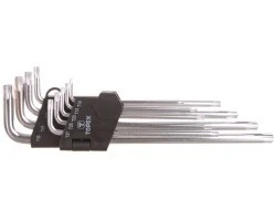 Dzięki nietypowej konstrukcji mogą one pracować przy znacznie większym obciążeniu nie uszkadzając bitów lub wkrętów. Co więcej, praca przy ich użyciu jest niezwykle wygodna i szybka. Przy zastosowaniu kluczy Torx użytkownik nie musi naciskać na narzędzie tak, jak w przypadku końcówek płasko-krzyżowych. Nie ma również obaw, że narzędzie ześlizgnie się z wkrętu podczas pracy. W prezentowanym zestawie znajduje się 9 kluczy o różnej wielkości: T10, T15, T20, T25, T27, T30, T40, T45 i T50.