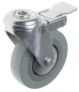 Nieoznaczana szara opona gumowa, lekka, polipropylenowa piasta. Kółka przemysłowe ogólnego przeznaczenia z nieoznakowaną szarą gumą. Dostępne jako mocowanie na płytce lub do montażu na trzonku i w zakresie udźwigu od 50 do 250 kg. Nadaje się do większości powierzchni podłogi. Kątownik stalowy Głowica wahliwa łożyska kulkowego Piasta polipropylenowa Dostępne wersje z hamulcem i bez hamulca