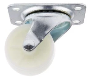 Kółko obrotowe, obudowa ze stali wytłaczanej, powlekane jasnym cynkiem, pasywowane na niebiesko, złącze z podwójnym przegubem łożyskowanym, oś kółka z nakrętką, płytka montażowa. Środek koła wykonany z polipropylenu, łożyska gładkiego.