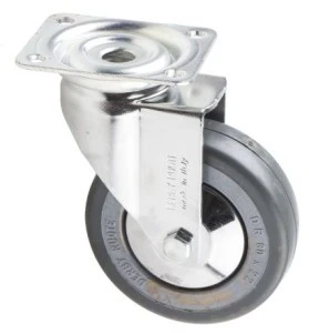 Szara opona gumowa, Antystatyczna - prostokątna TOP. Opony z gumy antystatycznej w kolorze szarym Chromowane widły Zastosowania o małym lub średnim obciążeniu Obrotowe kółka samonastawne z podwójną bieżnią kulkową w głowicy obrotowej
