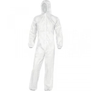 Kombinezon z kapturem obszytym gumką. Włóknina polipropylenowa, 40 g/m2. Zapinanie na zamek błyskawiczny. Gumka ściągająca w talii, kostkach i w nadgarstkach. Opakowanie jednostkowe, kolor biały rozmiar XL, zarkes rozmiarów: M DO XXL