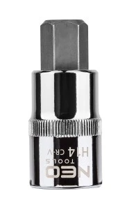 Końcówka sześciokątna na nasadce 1/2"" NEO (nr ref. 08-776) o rozmiarze H14, długości 55 mm, zgodna z normą DIN 7422. Nasadka wykonana z wytrzymałej stali chromowo-wanadowej. Końcówka sześciokątna z wysokogatunkowej stali stopowej S2. Jakość narzędzia potwierdzona certyfikatem TUV i 25-letnią gwarancją producenta. Marka NEO spełnia oczekiwania profesjonalistów.