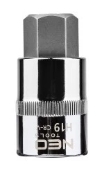 Końcówka sześciokątna na nasadce 1/2"" NEO (nr ref. 08-778) o rozmiarze H19, długości 55 mm, zgodna z normą DIN 7422. Nasadka wykonana z wytrzymałej stali chromowo-wanadowej. Końcówka sześciokątna z wysokogatunkowej stali stopowej S2. Jakość narzędzia potwierdzona certyfikatem TUV i 25-letnią gwarancją producenta. Marka NEO spełnia oczekiwania profesjonalistów.