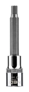 Końcówka sześciokątna na nasadce 1/2"" NEO (nr ref. 08-782) o rozmiarze H7, długości 100 mm, zgodna z normą DIN 7422. Nasadka wykonana z wytrzymałej stali chromowo-wanadowej. Końcówka sześciokątna z wysokogatunkowej stali stopowej S2. Jakość narzędzia potwierdzona certyfikatem TUV i 25-letnią gwarancją producenta. Marka NEO spełnia oczekiwania profesjonalistów.