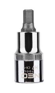 Końcówka sześciokątna na nasadce 1/2"" NEO (nr ref. 08-772) o rozmiarze H7, długości 55 mm, zgodna z normą DIN 7422. Nasadka wykonana z wytrzymałej stali chromowo-wanadowej. Końcówka sześciokątna z wysokogatunkowej stali stopowej S2. Jakość narzędzia potwierdzona certyfikatem TUV i 25-letnią gwarancją producenta. Marka NEO spełnia oczekiwania profesjonalistów.