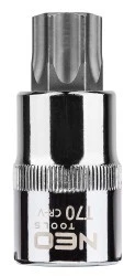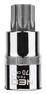 Końcówka Torx na nasadce 1/2"" NEO (nr ref. 08-759) o rozmiarze T70, długości 55 mm. Nasadka wykonana z wytrzymałej stali chromowo-wanadowej. Końcówka sześciokątna z wysokogatunkowej stali stopowej S2. Niezawodność produktu potwierdza 25-letnia gwarancja. Marka NEO spełnia oczekiwania profesjonalistów.