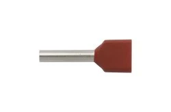 Podwójna końcówka tulejkowa z izolacją w kolorze czerwonym przeznaczona zaciskania na przewodach wielodrutowych o przekroju 1,5 mm2. Wykonana z ocynowanej miedzi, z izolacją poliamidową i długością tulejki 12 mm. Jej prawidłowe zamontowanie na przewodzie wymaga użycia specjalnej praski.